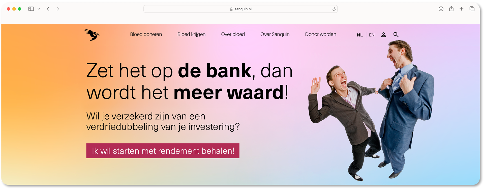 Jonge trader: “Ja, die vraag heb ik al wel duizend keer gekregen. Dan moet ik wel bij het begin beginnen. Kijk, traden zit in mijn bloed. Van jongs af aan ben ik bezig met handelen. Vroeger, vroeger speelde ik geen vader en moedertje. Nee ik speelde dat ik op de beurs stond te handelen. Ik heb een tijd geleden geïnvesteerd in bitcoin. Maar dat was niks, ik ben er tonnen mee verloren. Toen ik een jaar of 18 was, kwam ik een bank tegen. Johhhh nou, dat is mijn investering meer dan waard geweest. Ik heb mijn eerste inleg nu al verdrievoudigd. Het kost telkens maar drie kwartier van mijn tijd. En wat ik er wel allemaal niet voor terugkrijg, een drie levenslang rendement. Wil jij nou ook jouw inleg verdrievoudigen? Kijk dan bij de Sanquin bank, de bank waar je wel rendement behaalt. Want ik zeg maar zo: niet geld maakt geld, maar bloed maakt bloed. Dus zet het op de bank, dan wordt het meer waard.”